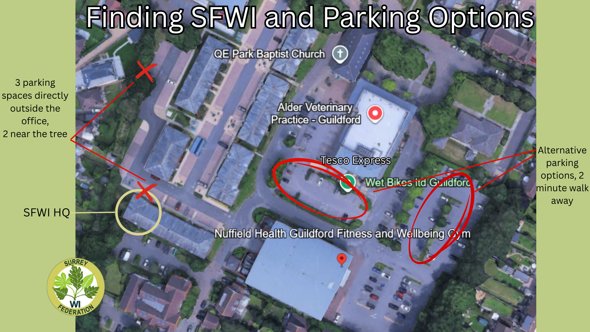 Take Burpham turnoff. Go straight across the first roundabout. At the second roundabout, turn right into Clay Lane (A3100). At the T-junction with the A320 turn left. At the roundabout take second exit onto Salt Box Lane. At the traffic lights turn left into Grange Road. At the roundabout take first exit, staying on Grange Road. Go straight on through next roundabout. Turn right into Railton Road. Take the first left onto Little Street. Follow the road round to the right in front of the Nuffield Gym, then left at the end of the sports building and immediately right. SFWI HQ is the final building in the terrace on the left.